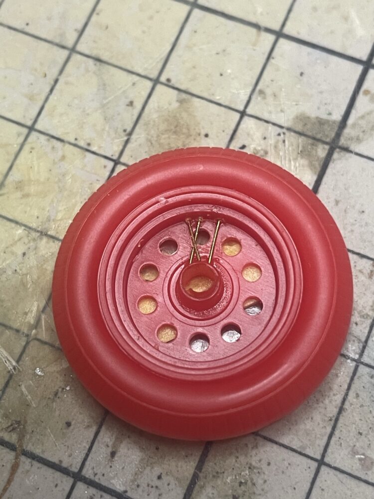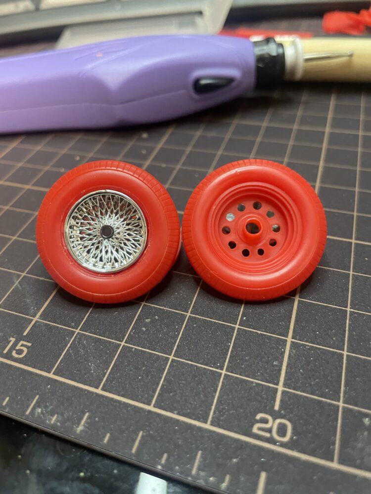 後はホイールですね、ホイールに関してはスポークが張られていないのは聞いていたので事前にミニ四駆用のスポークのホイールを用意しました。とりあえずものは試しって事で自力でスポーク作業をしてみますがガイドがほもそも存在しない状態なので相当厄介、ここは断念します。ただこのホイールタイヤと一体になっているので2つを分離する必要があるのでホイールをくり抜きます、なんでバラバラで作ってくれなかったんや。面倒な作業を終えてこんな感じ。ほんとは自力でスポーク張った方がリアルなんだとは思います。