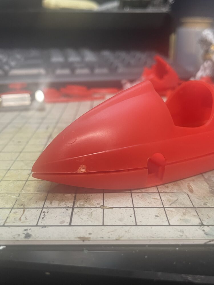 やっとここまで来たのでサフ塗装に入ります。ただこのボディ、モノコックと一体になっているようで表面はレッド、裏面はシルバーに塗り分ける必要があります。相当面倒です。そして足回りやメーター関係を接着しないとボディを接着も出来ない為ややこしい手順を踏む必要がありそう。筆塗りならそこまで面倒さは無いけどエアブラシになると厄介です。