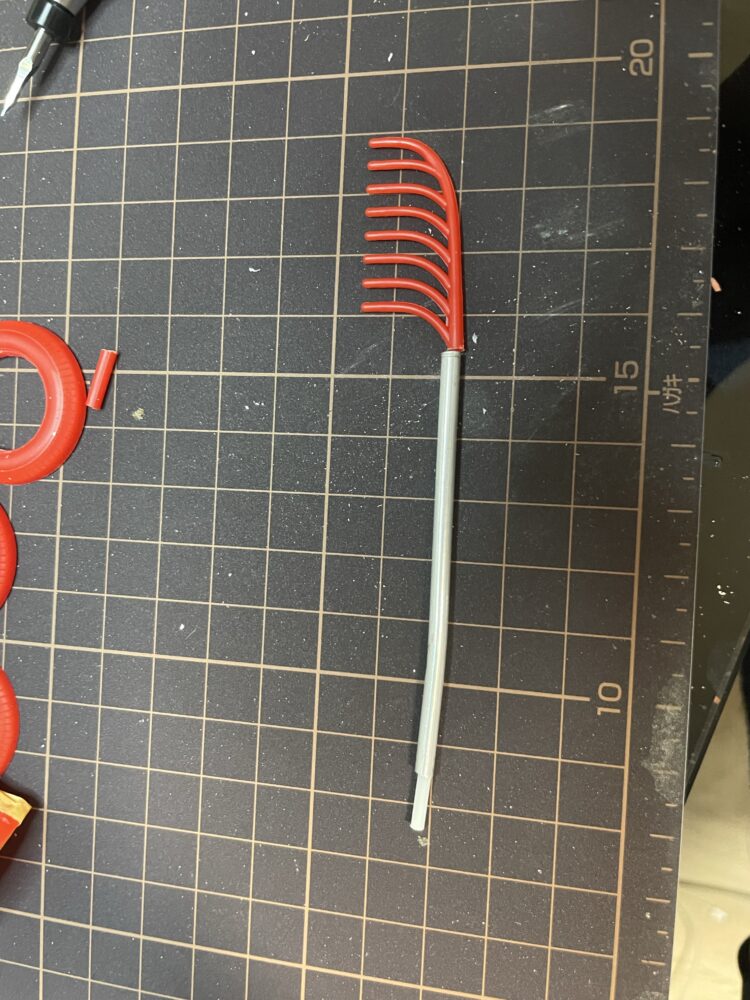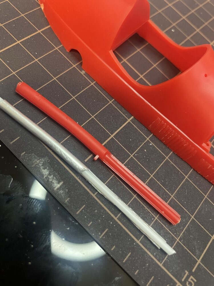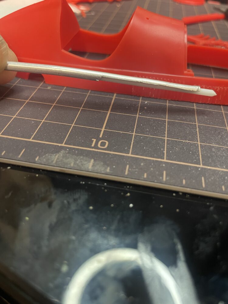 さらに続いてマフラー。プラパーツだとなんか微妙な気もするのでアルミパイプで置き換えました。微妙に曲がっている部分も合わせました。このマフラーは縦にカットされている?デザインなので再現を試みますが非常に難しい。デザインナイフやエッチングソー等でどうにかこうにか形にしました。これ以上はどうすればいいのか検討が尽きません。