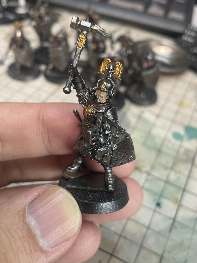 ここからシタデルで筆塗り塗装。今回は出来るだけ細部まで塗装します。今までは正直細かい所までやれる技術は無かったので。で、筆塗り終わり。やはりフォーミュラクロームが良い味を出してる気がします。盾のデカールも貼ります。