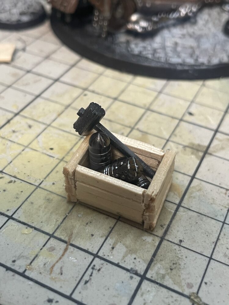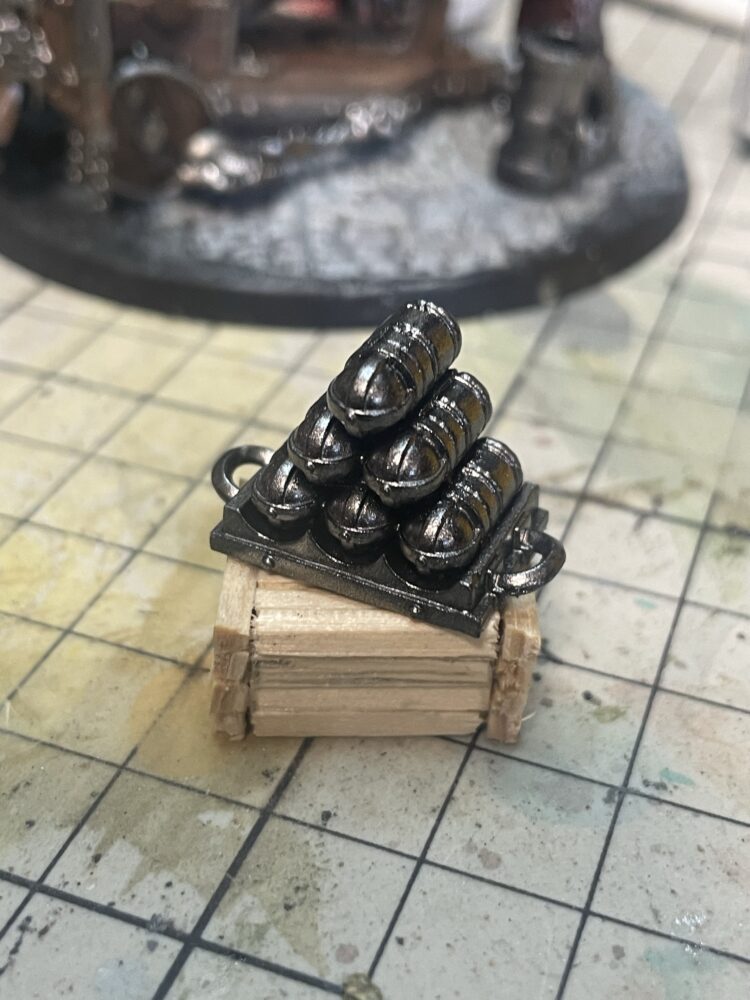 まぁこれぐらいで終わっても良いのですがせっかくなのでやれだけやります。まぁただの貧乏性なんですが。とりあえず石畳以外の部分は土表現。モデリングペーストと草素材で装飾。後は砲身を詰め込む人の周りに多少スペースがあるので自作の木箱なんかを作りました。100均のアイスの棒をカットして作成。