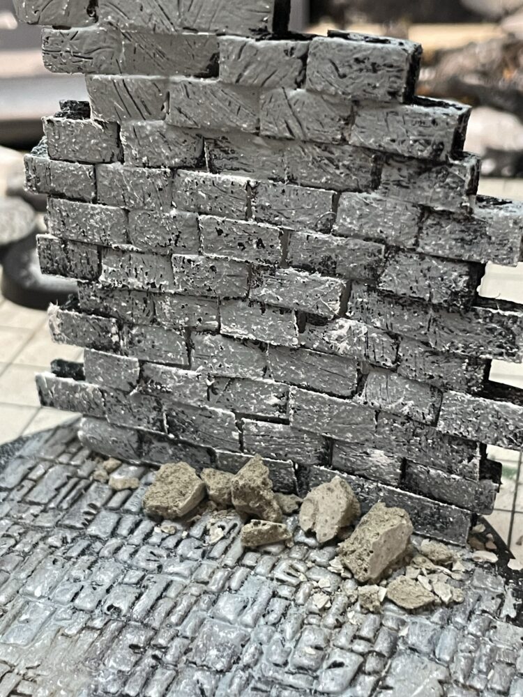 続いては壁ですね。やはりシティオブシグマーっていうぐらいなんで城壁みたいなものは欲しい。100均のスチレンボードで作成。少し筋を入れて作っても良かったんですが一つ一つ作成してレンガにします。貼り付けてグレーっぽいカラーでペイント。取り外しも考えて真鍮線で固定しました。