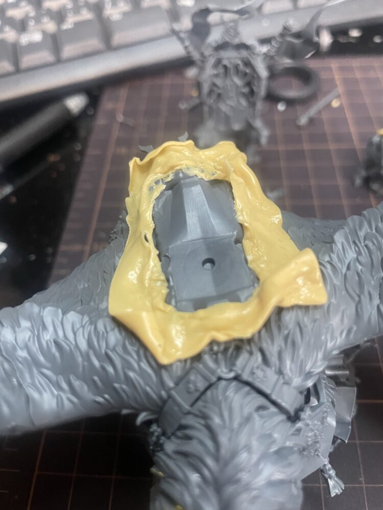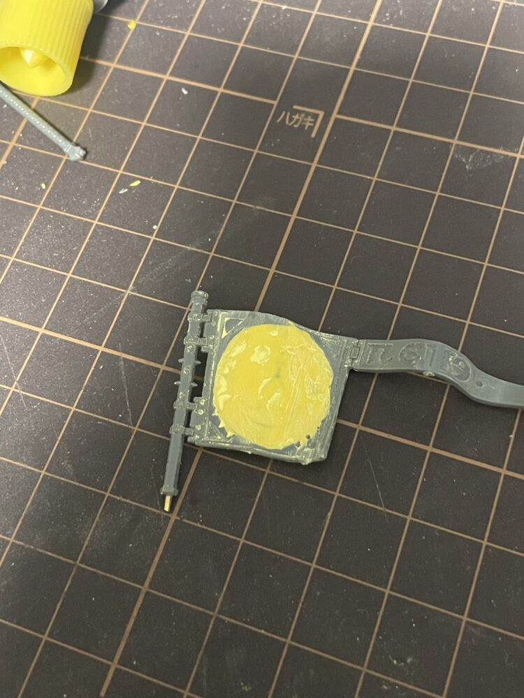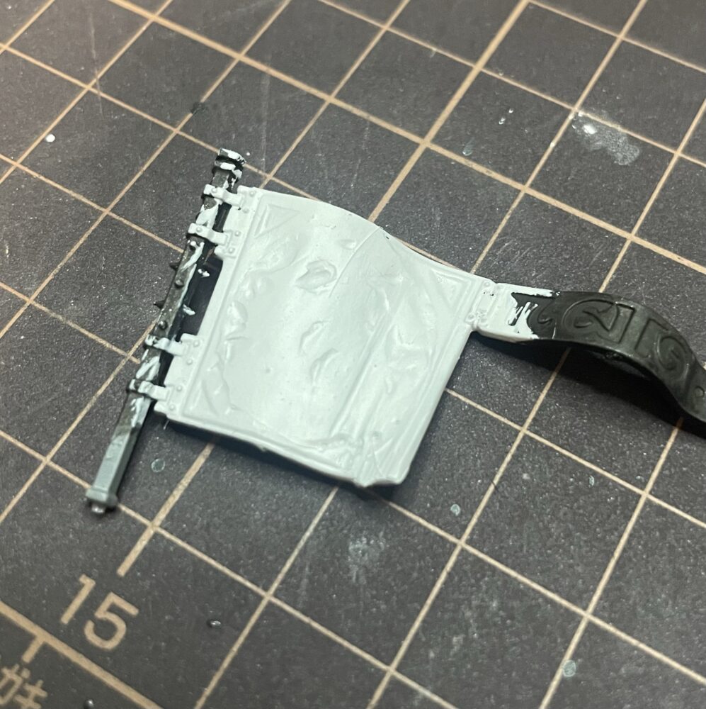 ストキャスから流用してきた旗なので旗デザインも出来ればシティオブシグマー仕様を目指します。とりあえずポリパテで旗モールドを埋めます。硬化後ヤスって平らにしたかったんですが気泡が入ったようで凸凹に。このまま突き進むかどうするか悩ましい。