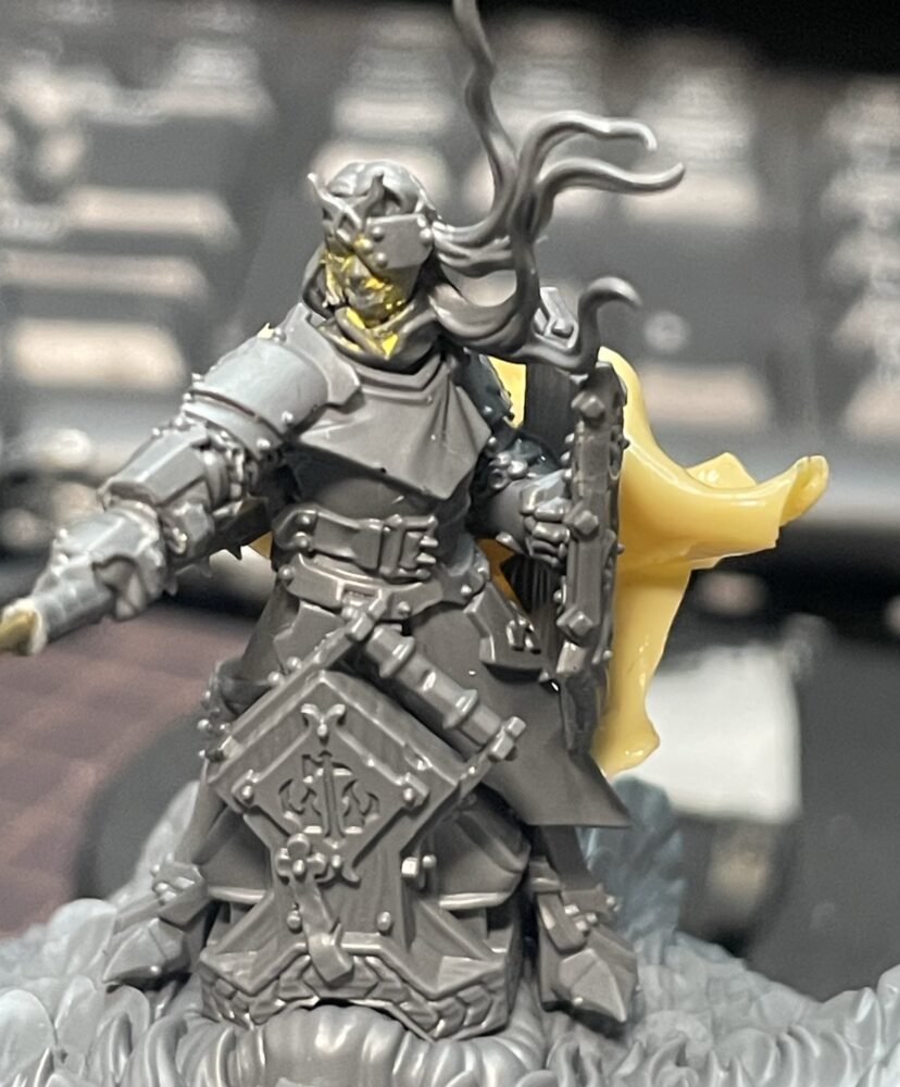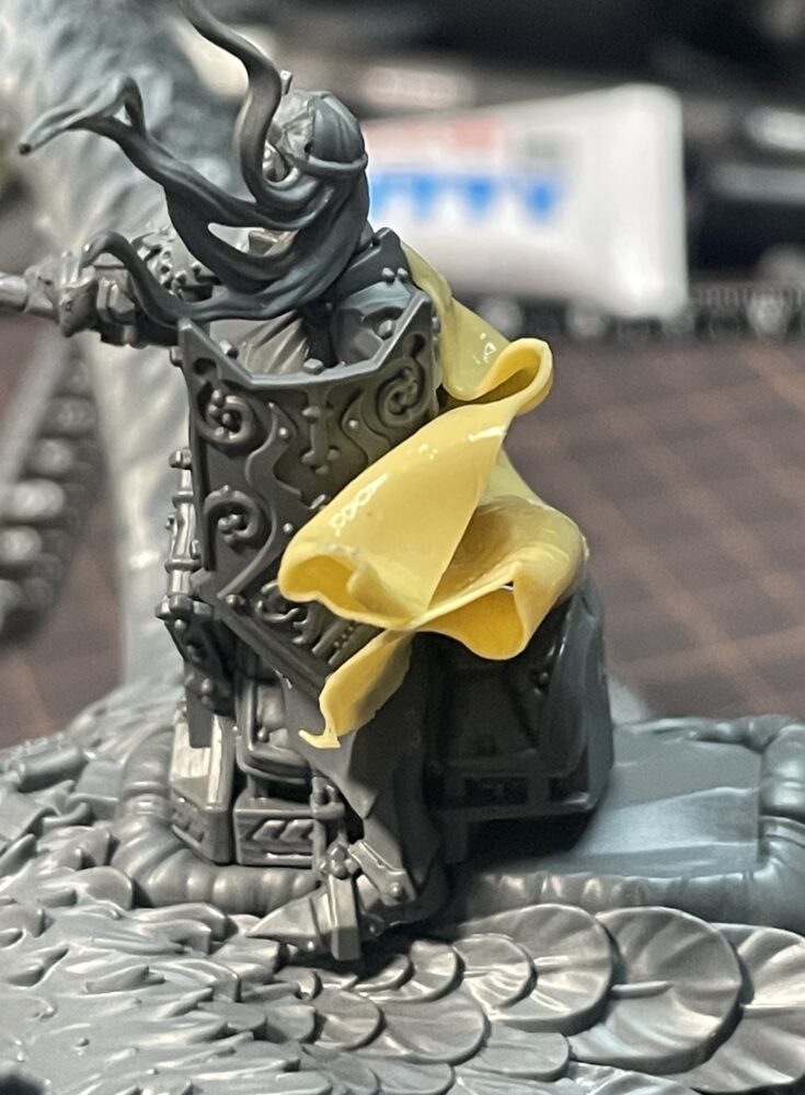 なんやかんややってる内にやはり総大将なんだからマントとか欲しいよなと思い至ったのでマントを自作します。やり方はエポキシパテを薄く伸ばして型を抜いてそれっぽくなるように形を仕上げていきます。多分少し置いて微妙に硬化し始めたぐらいのタイミングで皺を表現する方がやりやすい気がする。ターリア自信は相当風に煽られている感じなんでマントも相当なもんだと考えて強風が吹いてる体で作ります。